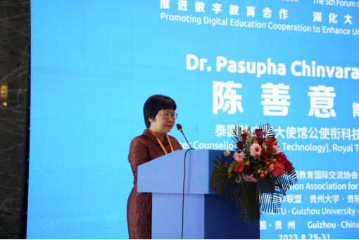 作为论坛的重要组成部分,在中泰大学校长论坛上,蔡英凤、蓬猜·蒙空瓦尼、张建华、宋塔温、潘查妮·高娜、贵州师范学院副校长任洁等积极探索智慧教育新模式,围绕“推进数字教育合作,深化大学互联互通”主题进行了深入交流,进一步深刻认识教育数字化的重要战略意义,拓宽中泰两国教育交流合作渠道,以期更好地服务两国高等教育合作需求、推进国际高等教育合作的理念与实践创新。报告中,蔡英凤围绕数字教育国际合作交流面临的新形势、数字教育赋能教育国际化的开云足球体育_开云足球(中国)实践以及深化数字教育国际合作的构想与建议,介绍了我校在数字教育赋能国际合作与交流高质量发展方面的经验与实践。