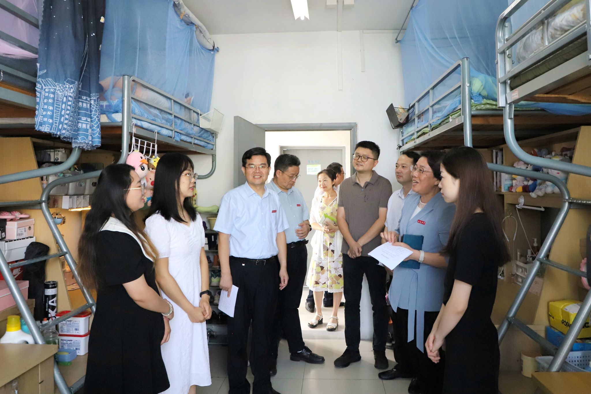 在学生宿舍,校领导与返校学生亲切交流,详细询问学生返校和假期情况,希望同学们调整好状态,迎接新学期。校领导详细了解了暑期学生家庭受灾情况,鼓励学生积极面对困难,同时要求相关部门与学院关心关爱学生,帮助家庭经济困难学生顺利渡过难关。