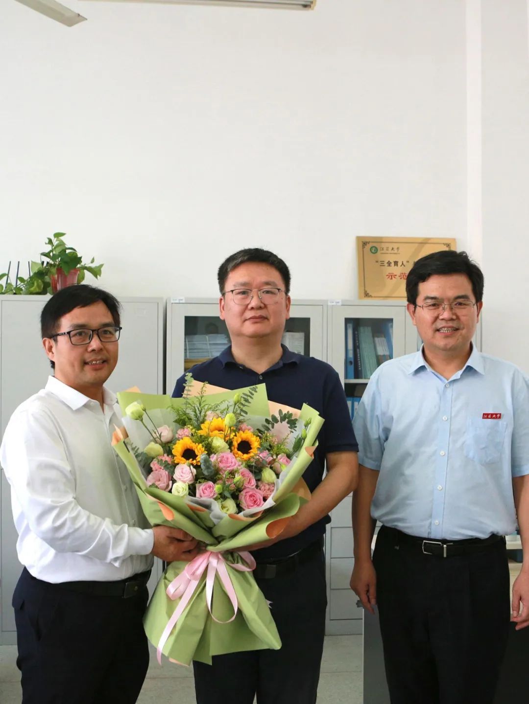 座谈会后,李洪波、邢卫红、王景全走访慰问了第三批“全国高校黄大年式教师团队”核心成员、原副校长、食品与生物工程学院教授赵杰文,国家教学名师、2023江苏教师年度人物、能源与动力工程学院教授王谦,江苏省教学名师、医学院教授胡嘉波,省高校教师教学竞赛一等奖获得者、药学院副教授孙竞,为他们献上鲜花并亲切交流。