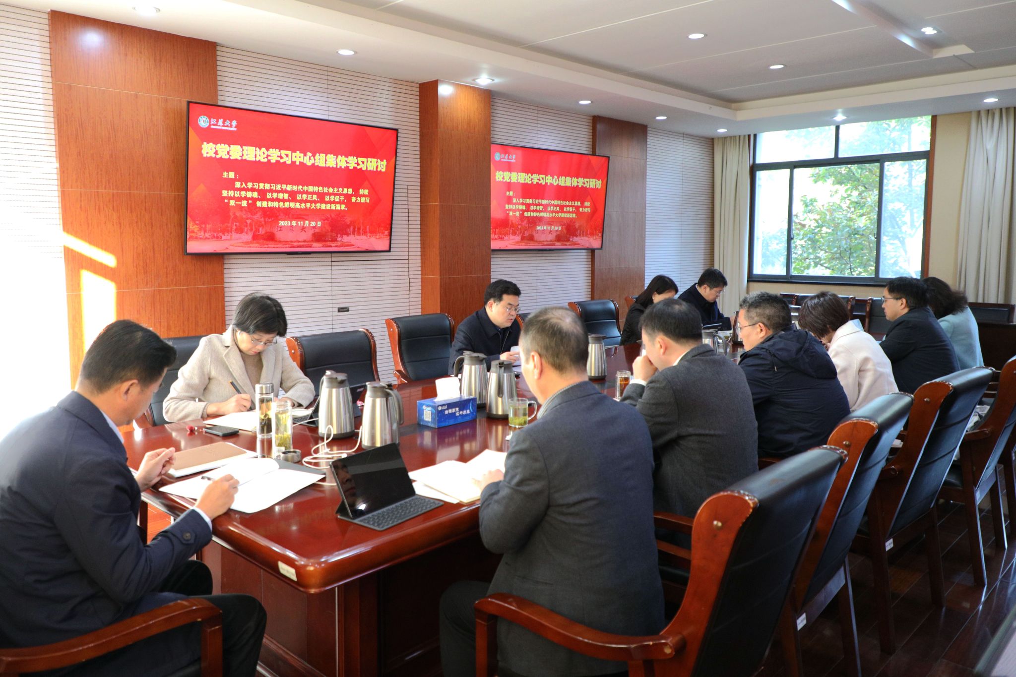 11月20日,校党委理论学习中心组在行政一号楼201会议室围绕深入学习贯彻习近平新时代中国特色社会主义思想开展集体学习研讨。在校校党委理论学习中心组成员参加学习,集体学习研讨由校党委书记李洪波主持。