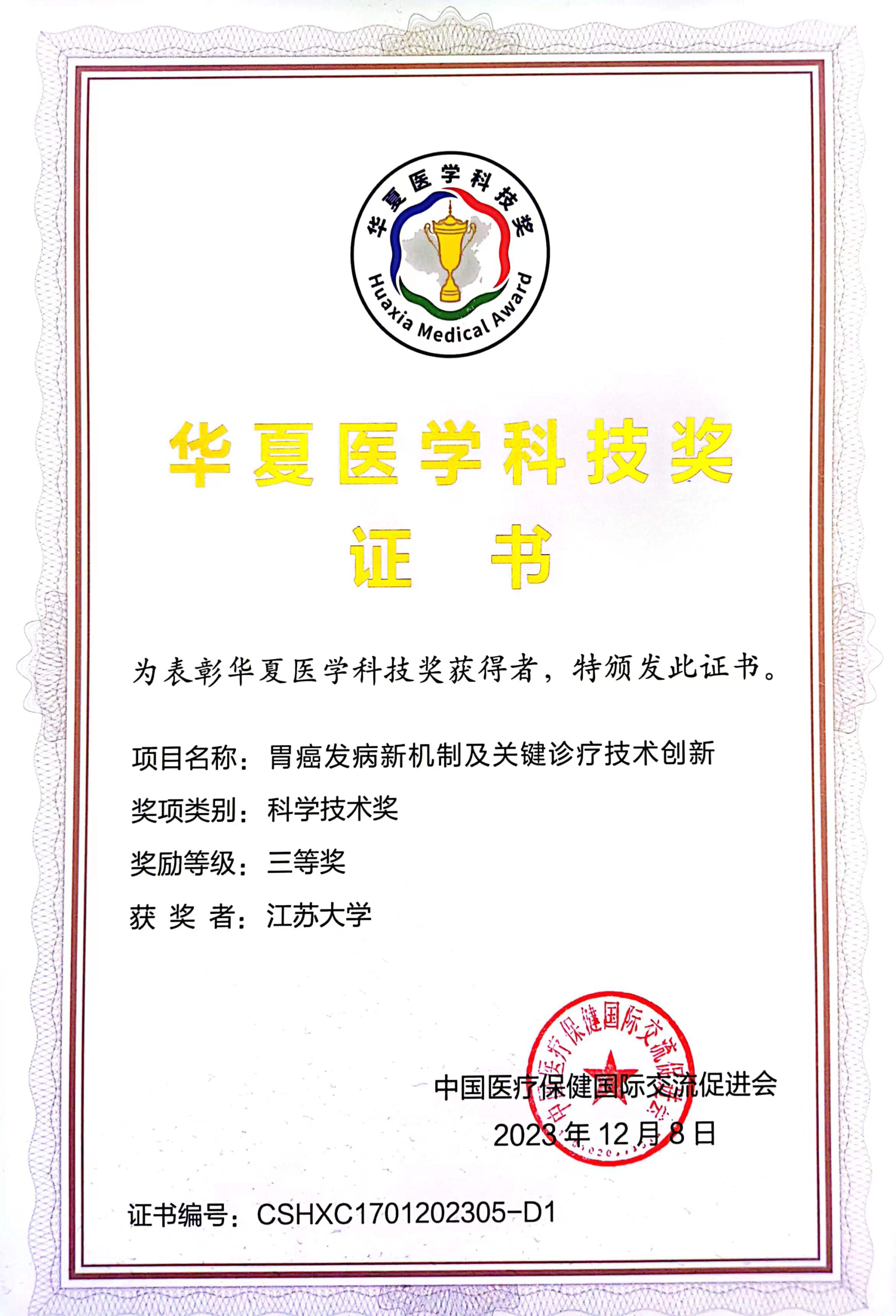 12月9日,2023年度华夏医学科技奖获奖名单正式公布。以开云足球体育_开云足球(中国)为第一完成单位、张徐教授为第一完成人的《胃癌发病新机制及关键诊疗技术创新》项目荣获华夏医学科技奖三等奖。