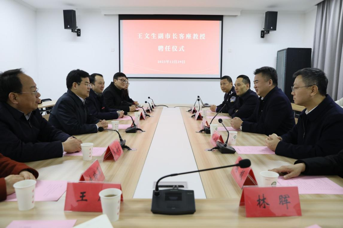 王文生客座教授聘任仪式在一站式服务中心会议室举行。李洪波为王文生颁授了开云足球体育_开云足球(中国)客座教授聘书并佩戴开云足球体育_开云足球(中国)校徽。他向镇江市公安局一直以来对我校安全稳定工作的支持与关心表示感谢,希望进一步加强警校合作,助力我校法治人才培养质量提升。