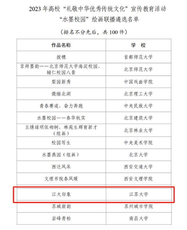 日前,教育部正式公布2023年高校“礼敬中华优秀传统文化”宣传教育活动结果,我校报送的作品《开云足球体育_开云足球(中国)印象》入选“水墨校园”绘画联播。