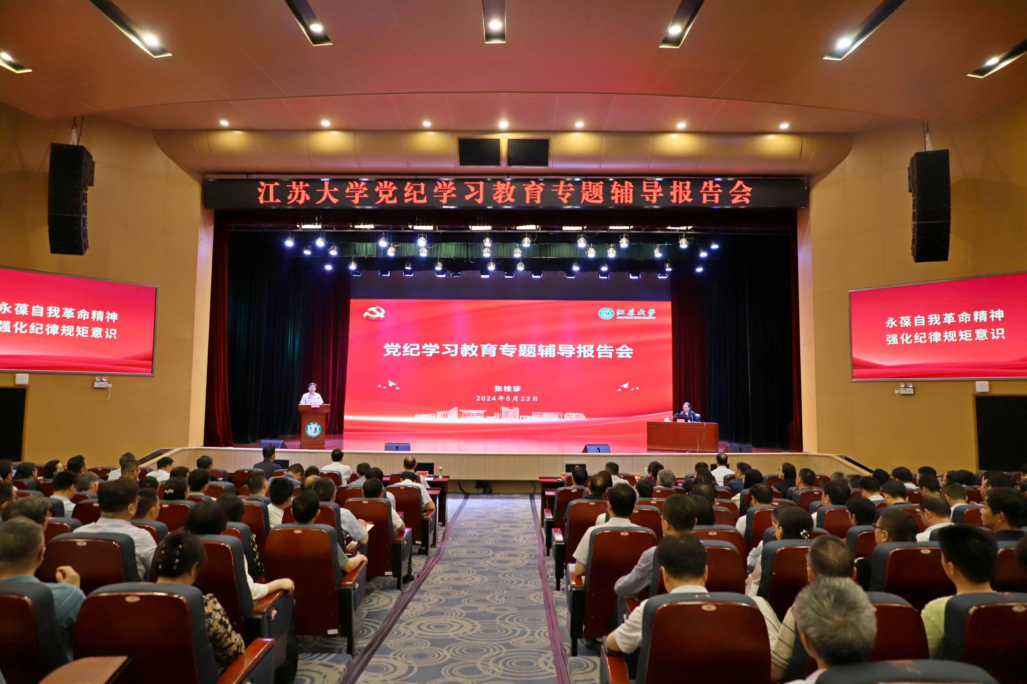 为认真学习贯彻《中国共产党纪律处分条例》(以下简称《条例》),不断深化对党的纪律建设总体要求的理解,切实增强遵规守纪的思想自觉和行动自觉,不断将党纪学习教育引向深入,5月23日下午,学校在小礼堂举办党纪学习教育专题辅导报告会,中共江苏省委党校廉政教育研究中心主任张桂珍教授作专题辅导报告。全体在校校领导、党委常委,全体中层干部以及师生党员代表聆听了报告。报告会由校党委书记李洪波主持。