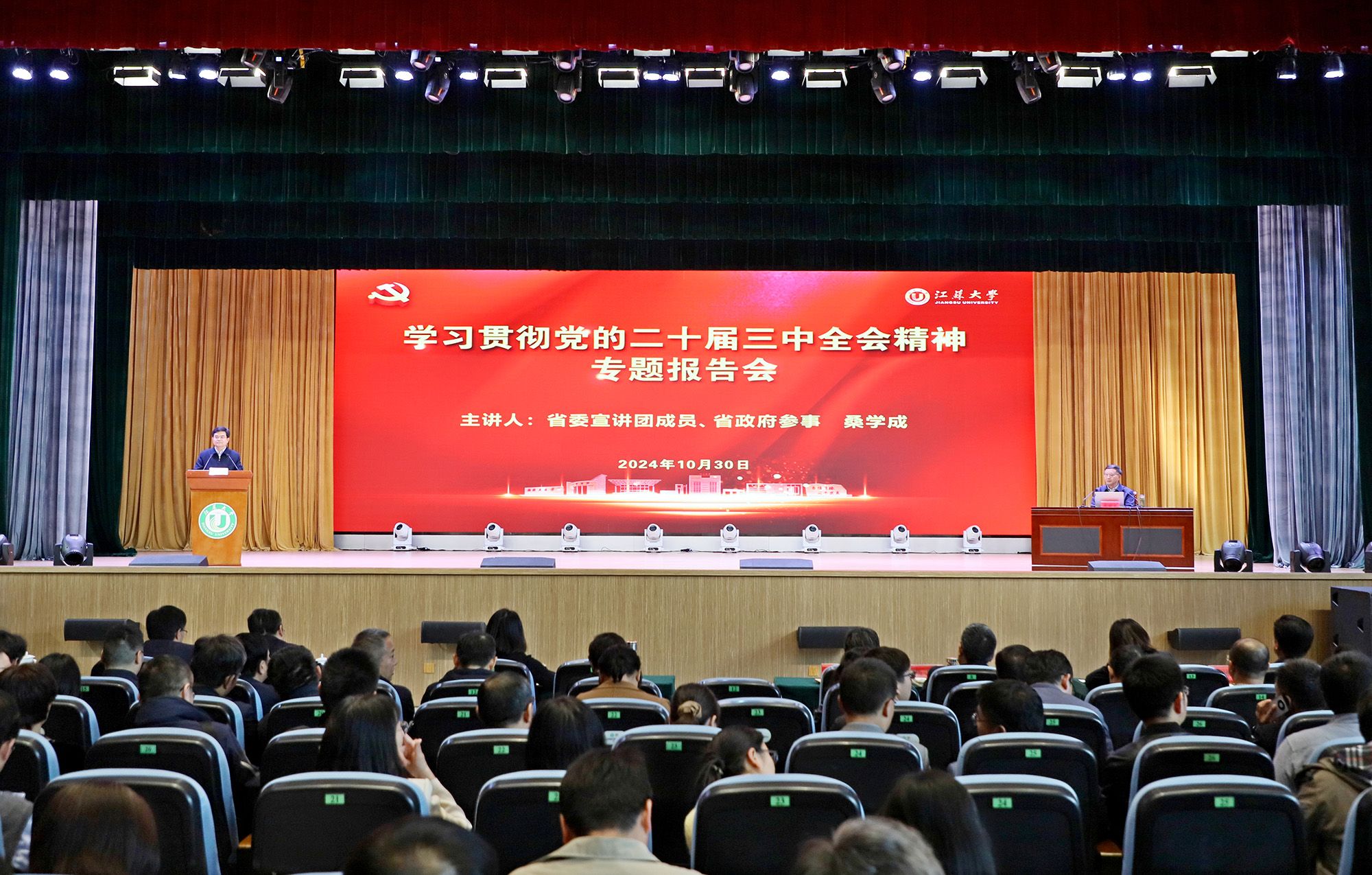 10月30日,学校在大礼堂举行学习贯彻党的二十届三中全会精神专家报告会,深入学习贯彻党的二十届三中全会精神。省委宣讲团成员、省政府参事、省委党校(江苏行政学院)原常务副校(院)长桑学成应邀作题为《新征程进一步全面深化改革的行动纲领——深刻领会和把握党的二十届三中全会精神》的专题报告。
