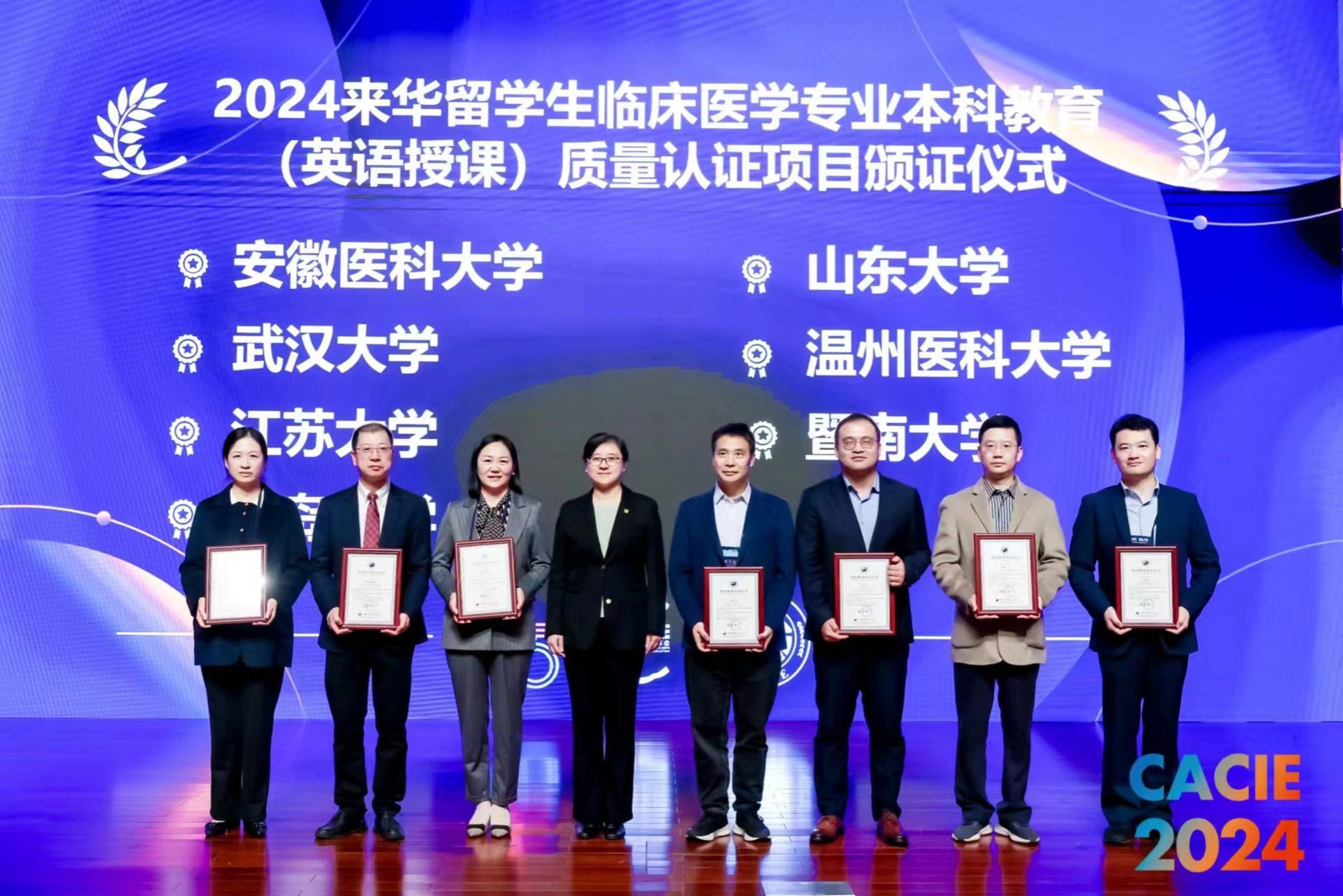 10月31日,第25届中国国际教育年会暨中国国际教育展在北京国家会议中心举行。在平行论坛“重塑升级、多元发展——面向未来的来华留学教育对话”上,中国教育国际交流协会副秘书长安延为通过来华留学生临床医学专业本科教育(英语授课)质量认证的高校颁发证书。我校成为全国首批获得认证的13所高校之一,认证有效期为5年。海外教育学院院长吴鹏受邀出席会议并代表学校接受证书。
