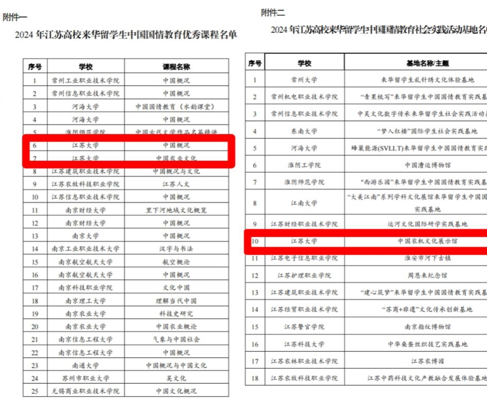近日,江苏省高等教育学会外国留学生教育管理研究委员会公布了2024年江苏高校来华留学生中国国情教育优秀课程和社会实践活动基地名单。我校遴选推送的“中国概况”“中国农业文化”两门课程入选“江苏高校来华留学生中国国情教育优秀课程”;“中国农机文化展示馆”入选“江苏高校来华留学生中国国情教育社会实践活动基地”,并推荐参加教育部来华留学生中国国情教育社会实践活动基地评选。