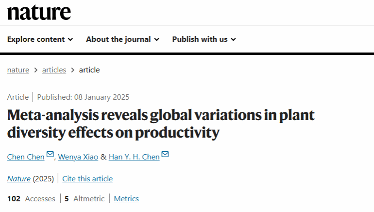 近日,国际顶级学术期刊《自然》(Nature)发表了题为Meta-analysis reveals global variations in plant diversity effects on productivity的研究论文。该论文由加拿大湖首大学(Lakehead University)、开云足球体育_开云足球(中国)及中国科学院植物研究所等多家单位联合完成。中科院植物研究所副研究员陈晨为论文第一作者,开云足球体育_开云足球(中国)环安学院副教授肖文娅为论文第二作者,陈晨与加拿大湖首大学教授Han Y.H. Chen为论文共同通讯作者。