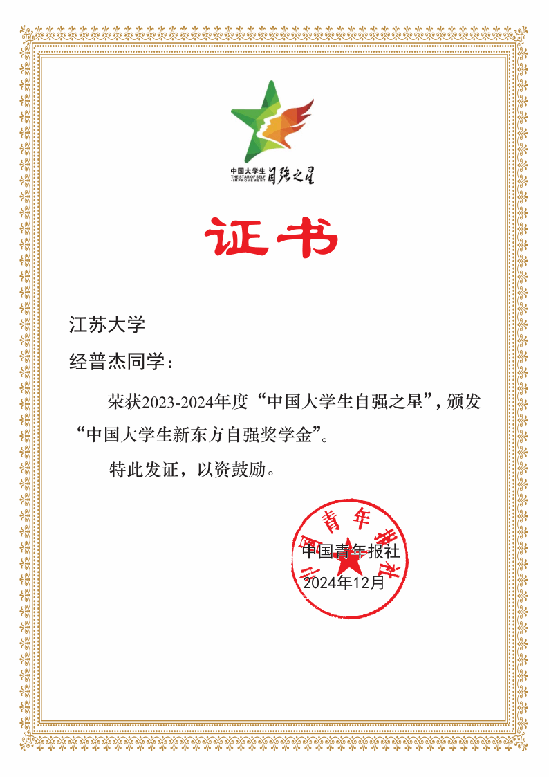 近日,由共青团中央、全国学联主办的寻访“中国大学生自强之星”活动评选结果揭晓。我校能源与动力工程学院张俊杰同学、计算机科学与通信工程学院经普杰同学荣获2023-2024年度“中国大学生自强之星”。