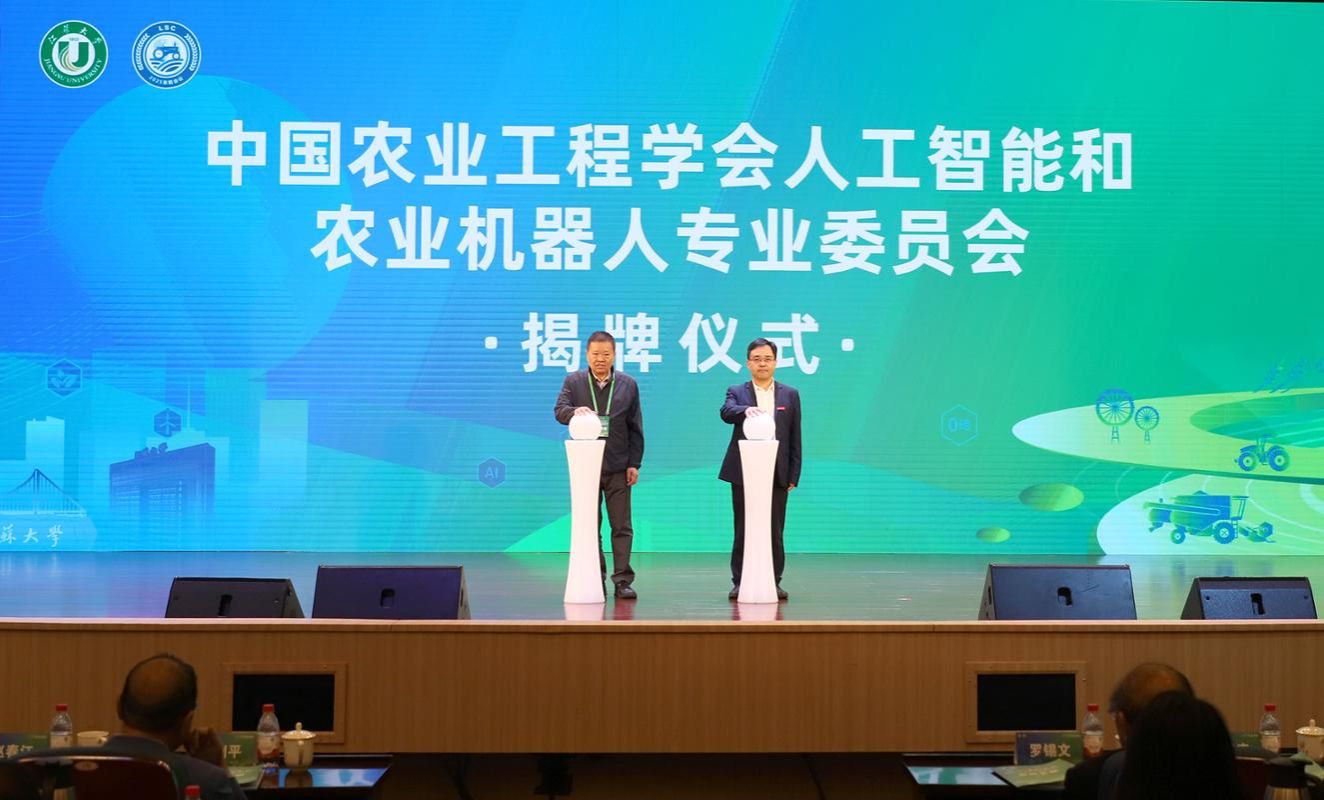 朱明和副校长王景全共同按动启动柱,为“中国农业工程学会人工智能和农业机器人专业委员会”揭牌。