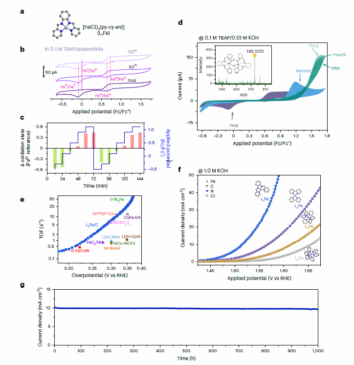 在双碳背景下,可持续电催化CO2还原和水氧化是缓解环境问题的有效途径。然而,阳极析氧反应(OER)过电位高,能耗大,对稀缺贵金属依赖性强以及目前对电还原催化剂的性能和机理理解不足等问题限制了其应用。鉴于此,该研究报道了一种活性双铁电催化剂[Fe2(µ-O)(µ-OH(L1)2],其中L1是含氮配体。该催化剂在OER反应中表现出优异的性能,在1.580V下实现20.2s−1的转换频率,在10mA cm-2的电流密度下具有184mV的超低过电位,并且在1000h内具有出色稳定性。通过自旋交叉驱动的二聚机制,实现了从单铁到双铁活性构型的转变,增强了金属-配体共价性,有助于高效双活性位点OER催化反应的关键中间体O-O的形成,显著提升了催化活性和稳定性,为高性能OER催化剂的设计提供了新的思路。该研究不仅推进了绿色制氢、动态活性位点演化和自旋态调控的作用,还为可持续电化学CO2还原和绿色析氢领域分子催化剂的设计提供了宝贵的机理见解。该工作凸显了连接水氧化与CO2利用、迈向碳中和能源体系的统一设计原则。