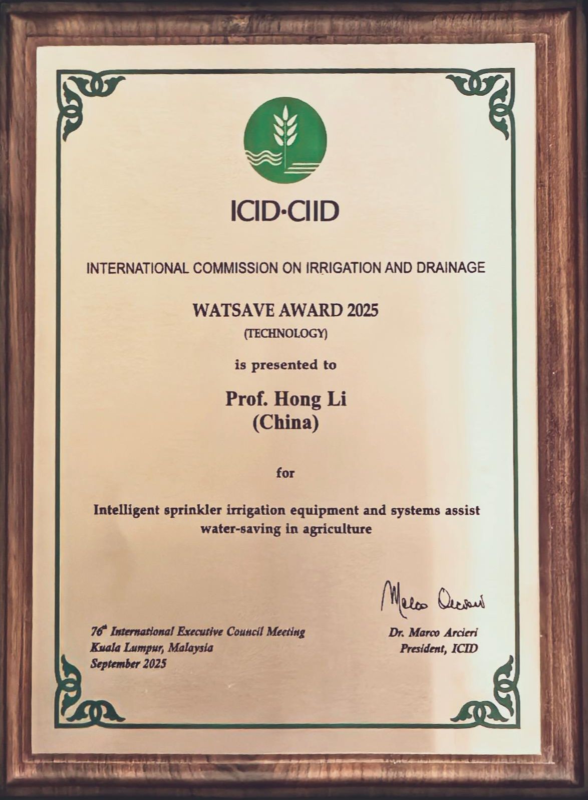 9月7日至13日,国际灌溉排水委员会(The International Commission of Irrigation and Drainage,简称ICID)第76届国际执行理事会全体会议暨第四届世界灌溉论坛(4th World Irrigation Forum,简称WIF4)在马来西亚吉隆坡举行。校党委常委、副校长、节水灌溉装备与技术方向学术带头人李红教授被授予“ICID节水技术奖”,该奖项是国际灌排技术领域的最高奖项,每年全球仅授予1人。
