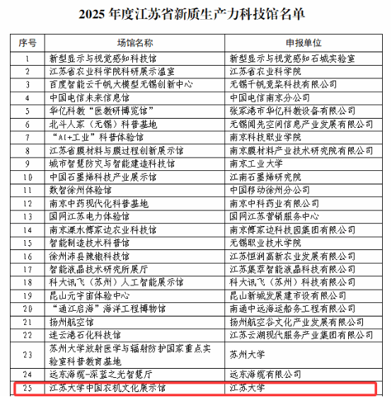 近日,江苏省科协公布了2025年度江苏省新质生产力科技馆认定结果,我校中国农机文化展示馆入选其中。