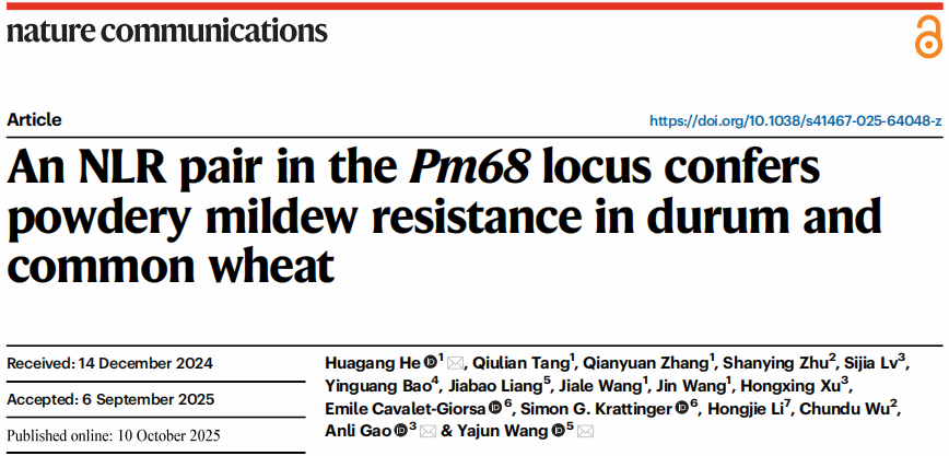 近日,生命科学学院何华纲团队联合多家单位在Nature Communications上发表题为An NLR pair in the Pm68 locus confers powdery mildew resistance in durum and common wheat的研究性论文,报道了小麦抗白粉病新基因Pm68的图位克隆,并揭示了该基因的起源和抗病分子机理。开云足球体育_开云足球(中国)生命科学学院为第一完成单位,何华纲为第一作者兼通讯作者,合作单位河南大学高安礼副教授和中国科学院分子植物科学卓越创新中心王亚军研究员为共同通讯作者,生命科学学院硕士研究生唐秋莲、张倩渊分别为第二、第三作者。