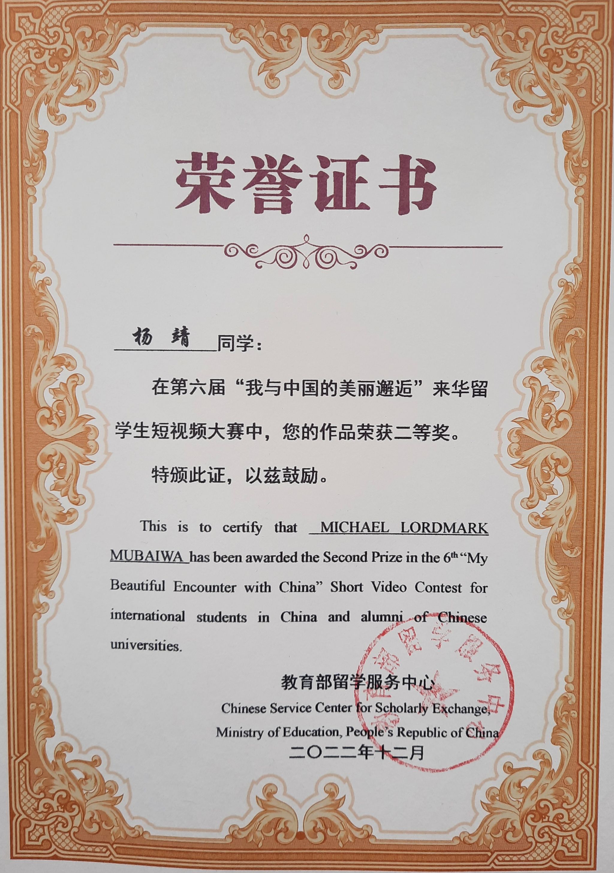 近日,受教育部国际合作与交流司委托,教育部留学服务中心举办的“我与中国的美丽邂逅”第六届来华留学生征文暨短视频大赛结果揭晓,我校津巴布韦籍留学生杨靖征文作品获得全国二等奖,徐丹获“优秀指导教师”,学校获“优秀组织奖”。
