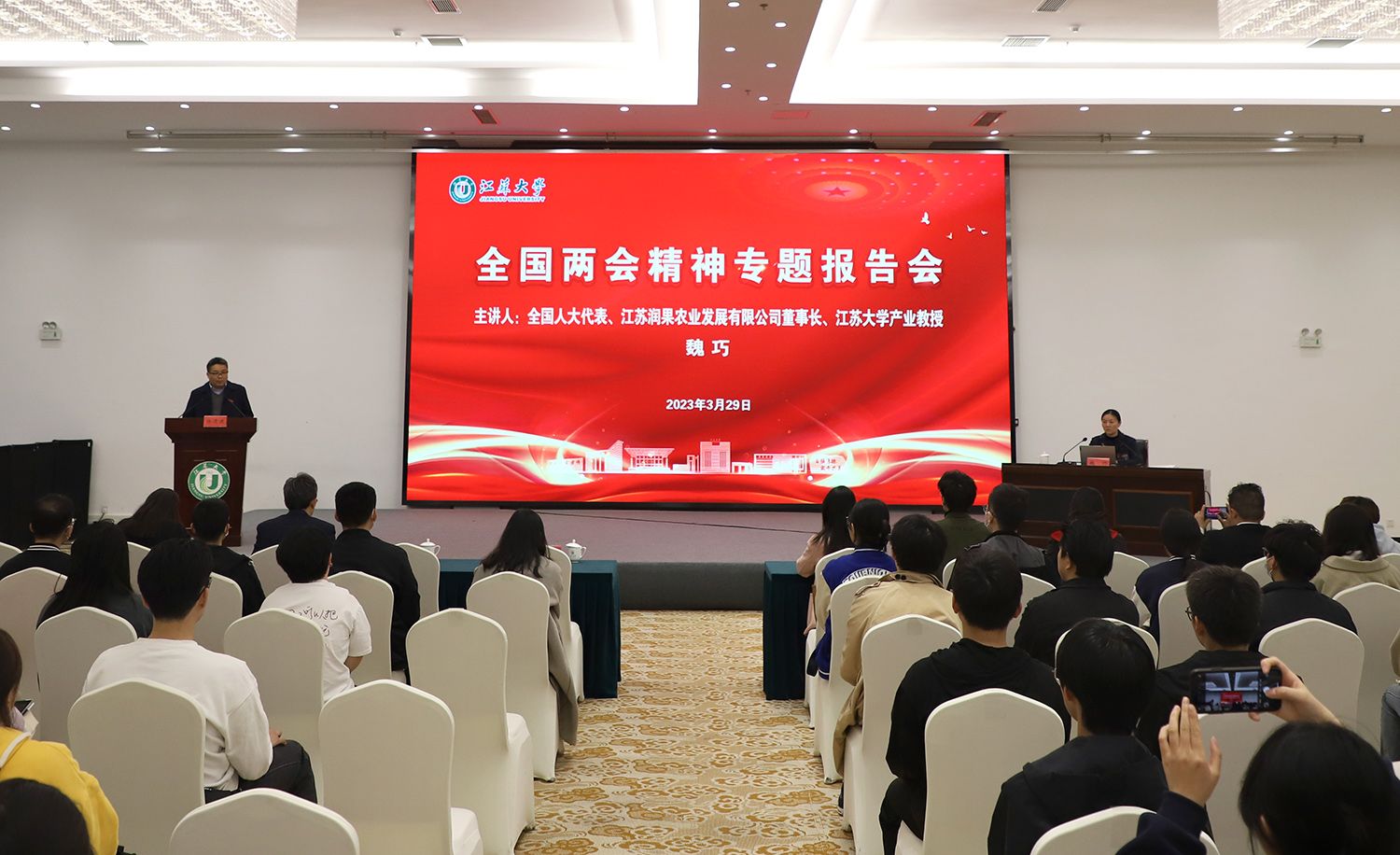 3月29日,开云足球体育_开云足球(中国)全国两会精神专题报告会在青教公寓多功能厅举行。全国人大代表、镇江市镇江新区永兴农机机械化专业合作社理事长、江苏润果农业发展有限公司董事长、开云足球体育_开云足球(中国)产业教授魏巧走进校园,为师生作全国两会精神专题报告。报告会由校党委常委、宣传部部长杨道建主持。