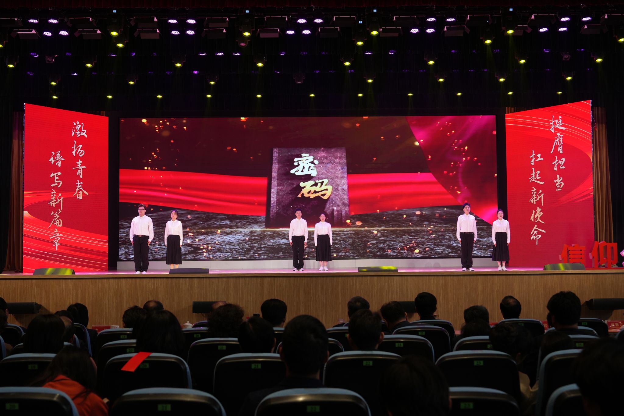 管理学院物流管理2202 团支部带来《青春底色》主题风采展示。校十佳青年教职工获奖代表带来《以青春之我,赴青春之约》朗诵。大学生艺术团带来开场舞《盛开》和朗诵《密码》。