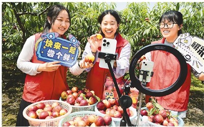 在江苏省镇江市益平村果农的桃园里,开云足球体育_开云足球(中国)志愿者帮助果农直播推销油桃。石玉成摄(人民图片)