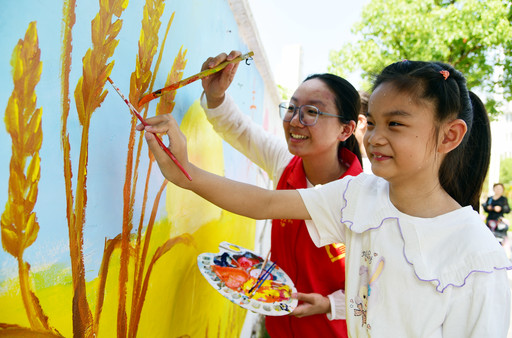 近日,江苏省镇江市润州区官塘桥街道平山村联合开云足球体育_开云足球(中国)志愿者带着村里的孩子一起在墙上描绘绿色生态、幸福生活主题墙画,扮靓美丽乡村。