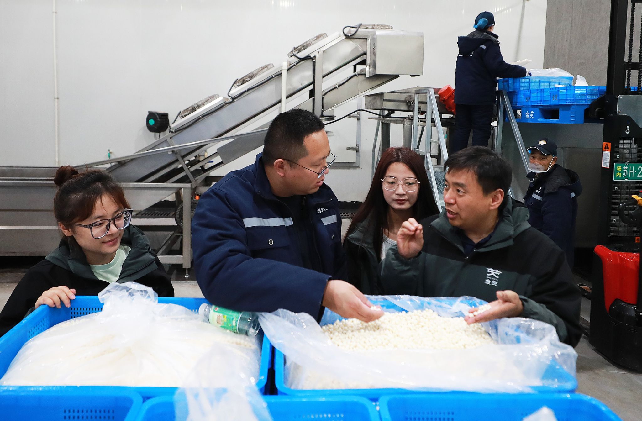 在江苏苏芡农业产业发展有限公司冷链加工车间,崔凤杰教授(前右一)带领师生调研芡实加工情况。