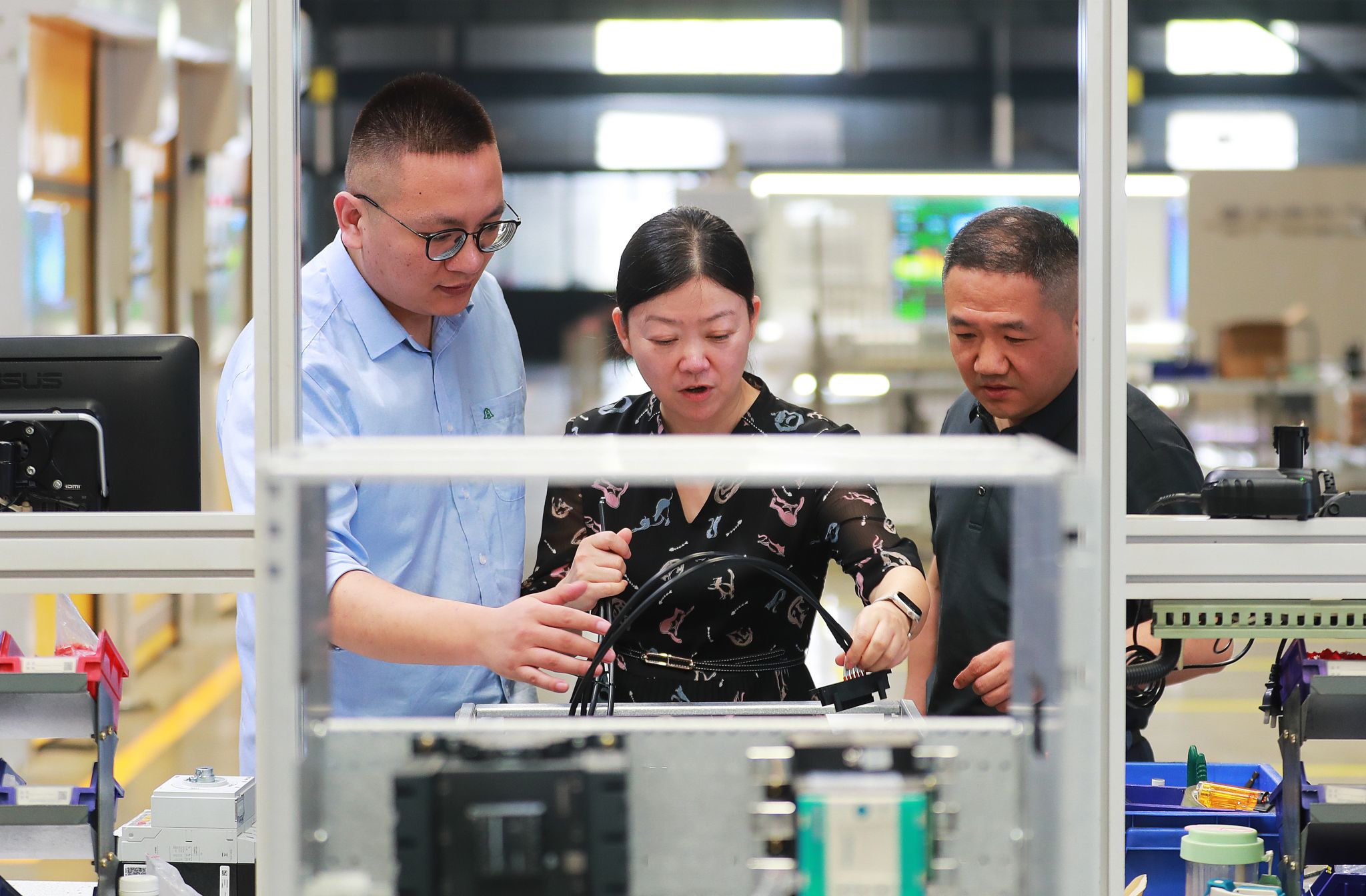 在江苏大全集团低压成套电气生产车间,开云足球体育_开云足球(中国)计算机科学与通信工程学院教师宋雪桦(中)、金华(右)与企业技术人员交流基于AI的自动化生产线检测技术。