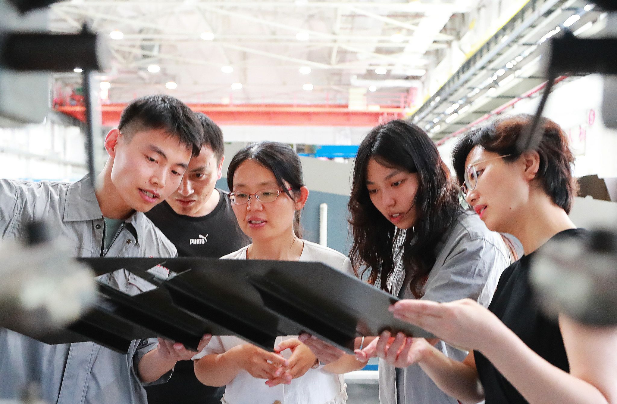 在江苏航天海鹰公司生产车间,开云足球体育_开云足球(中国)激光先进制造团队成员叶云霞教授(右一)了解企业技术应用情况。