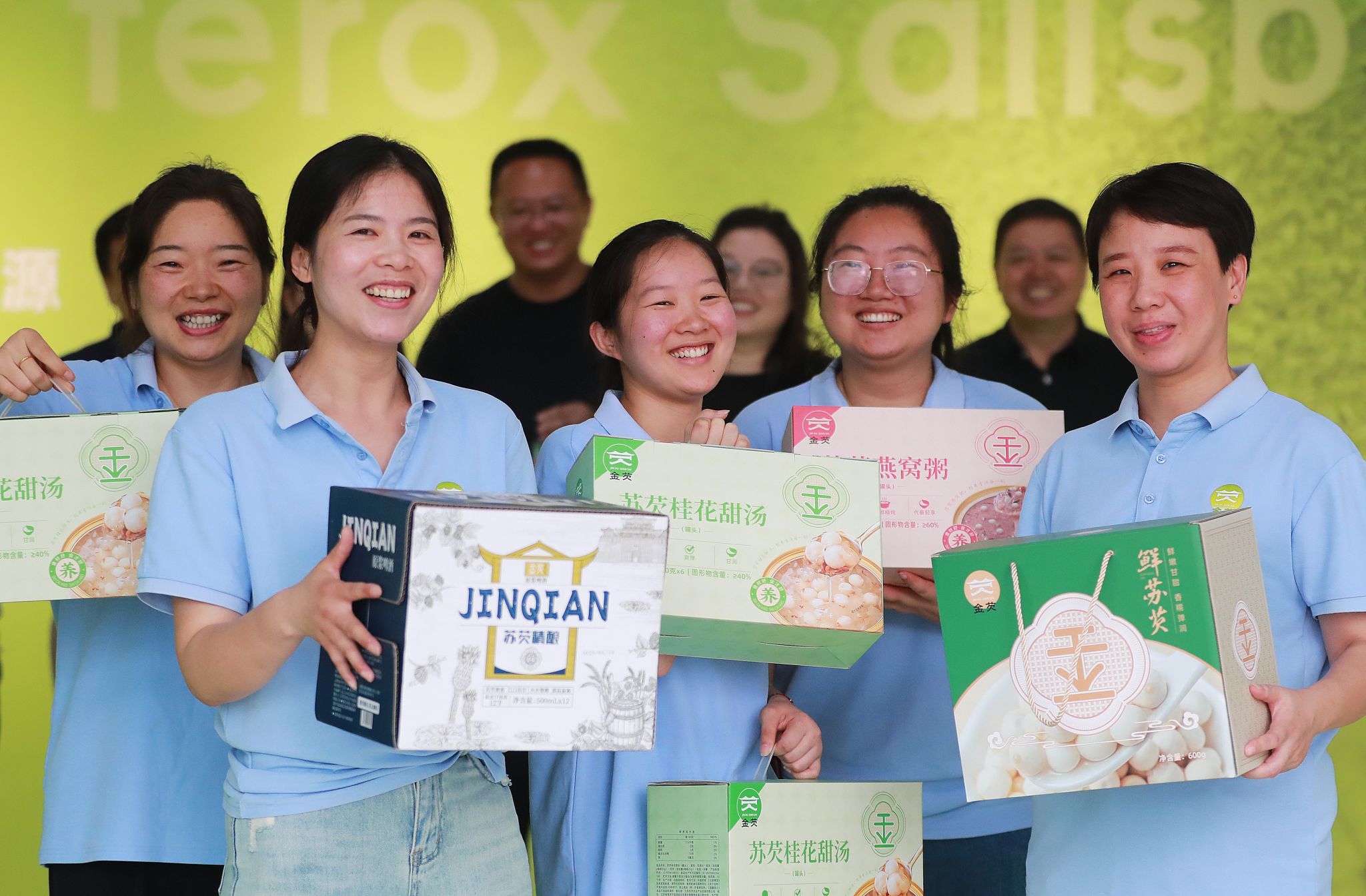 在江苏苏芡农业产业发展有限公司,女工们展示公司开发的芡实系列产品。