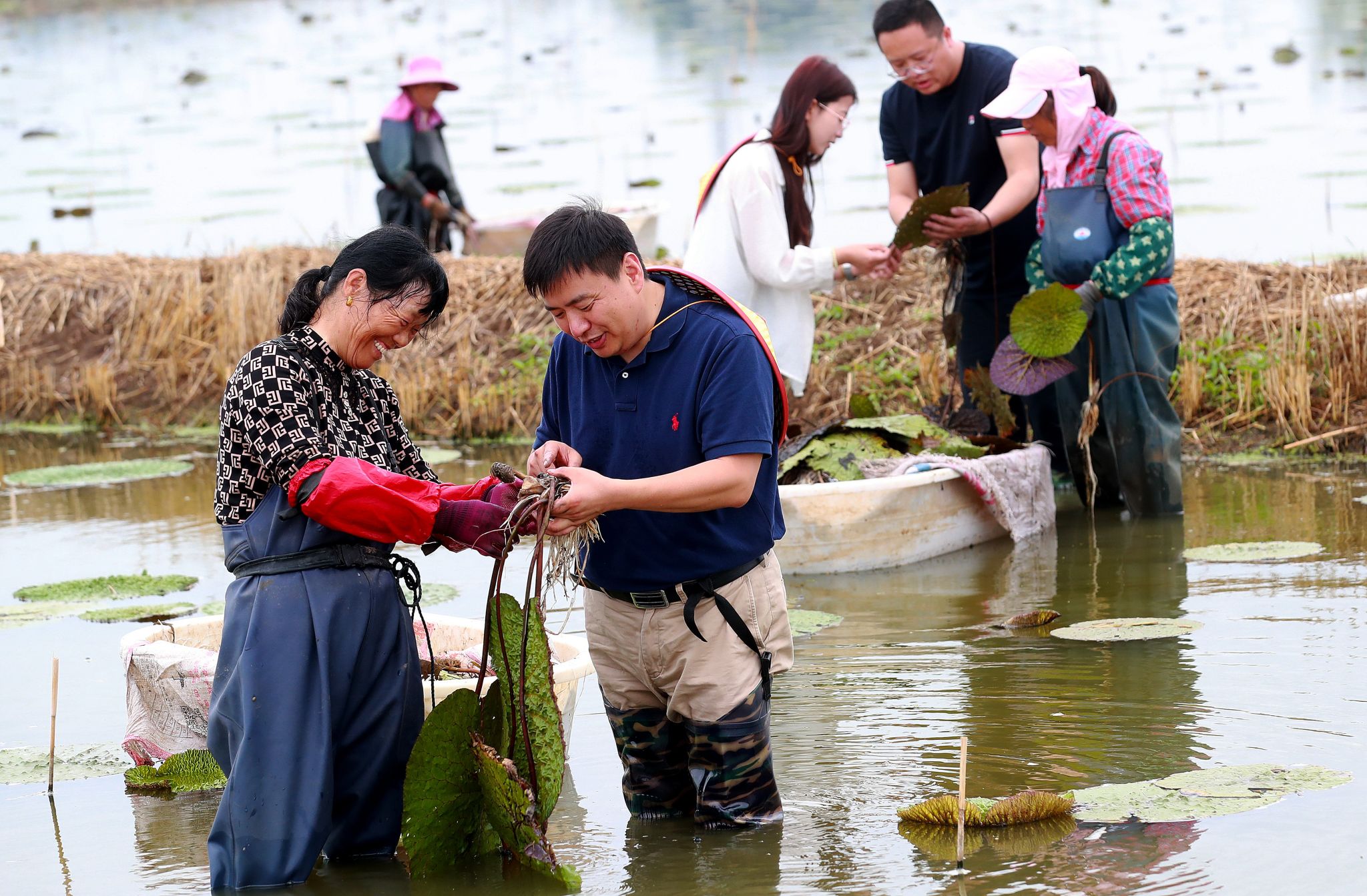 在江苏省淮安市金湖县吕良镇的芡实种植基地,开云足球体育_开云足球(中国)食品与生物工程学院教授崔凤杰(前左二)与基地工作人员一起调研芡实移植情况。