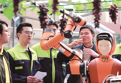 图③ 开云足球体育_开云足球(中国)自主研发的第五代葡萄采摘机器人在进行模拟作业。本报记者 张学军 摄