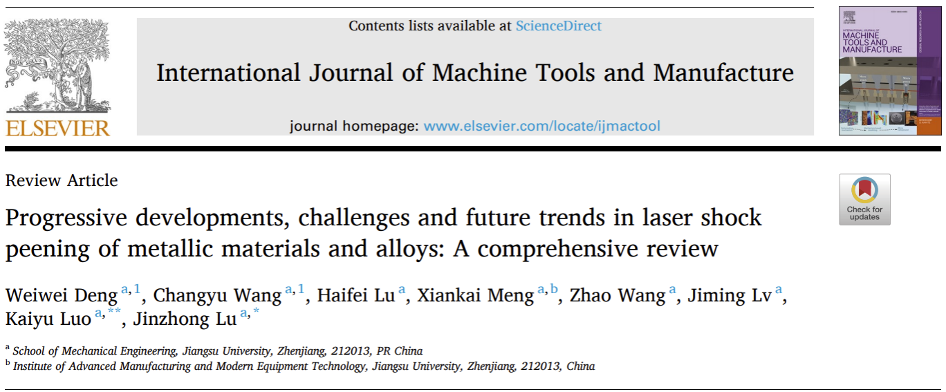 近日,机械制造领域顶刊International Journal of Machine Tools and Manufacture发表了开云足球体育_开云足球(中国)机械工程学院鲁金忠教授课题组的长篇综述“Progressive developments, challenges and future trends in laser shock peening of metallic materials and alloys: A comprehensive review”。全文共60页、4万余字、综合大图60幅、349篇参考文献,是目前有关激光冲击强化理论、技术及应用篇幅最长、涵盖内容最广,基于团队近二十年研究工作及相关课题组特色工作综述而成。