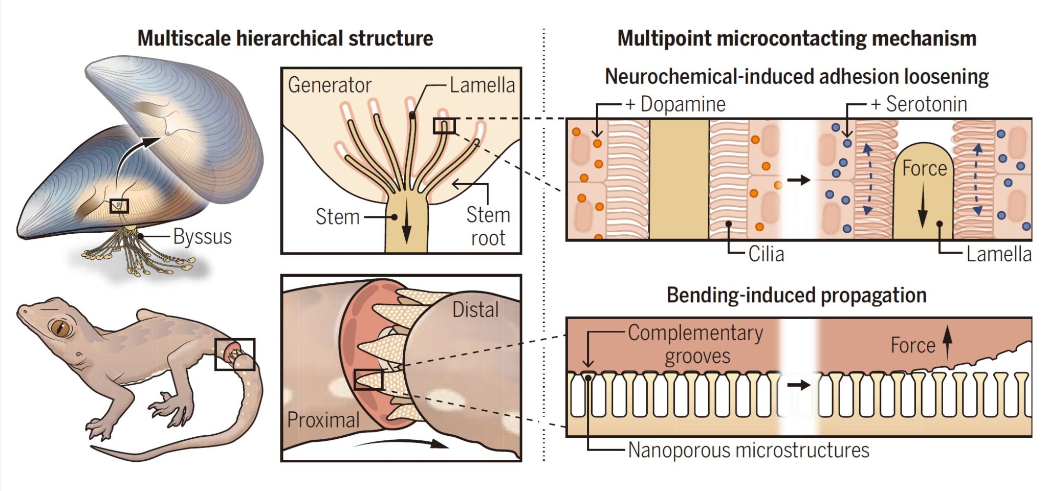 论文通过剖析加拿大麦吉尔大学和美国纽约大学等研究人员近期发表的关于动态生物界面的重要研究发现(Doi: 10.1126/science.adi7401; 10.1126/science.abh1614),并结合近年来医用材料表界面领域的最新进展,对生物材料仿生设计以及医用材料—组织的兼容性等相关问题进行了重点评述与展望。文章探讨了海洋贻贝的动态粘附机制,通过分析已被揭示的足丝(贻贝所分泌的非生命蛋白类材料)与自体组织之间的多尺度递阶结构(Multiscale hierarchical structure),强调多点微接触机制(Multipoint microcontacting mechanism)是贻贝—足丝动态生物界面间可控连接的关键,而非完全依赖其表面特殊的化学相互作用。文章指出,这种天然的动态多尺度递阶生物界面所涉及的多点微接触机制并非是贻贝类生物体内独有的,相关机制有望为动态的组织兼容性生物材料提供设计思路。文章特别提到,在爬行纲蜥蜴目壁虎类动物的尾部两段界面处也存在多尺度递阶结构,这一结构可确保尾巴与蜥蜴身体的稳定连接。然而当其受到威胁时,尾部摆动触发的局部微接触点破坏可引发整个界面的断裂,即自切行为。基于这些发现,文章提出独特见解,推断多点微尺度接触机制可能是实现强大而动态表界面相互作用的通用策略,并且这一机制可能同样存在于尚未探究的虾蟹类螯(爪)自断行为之中。