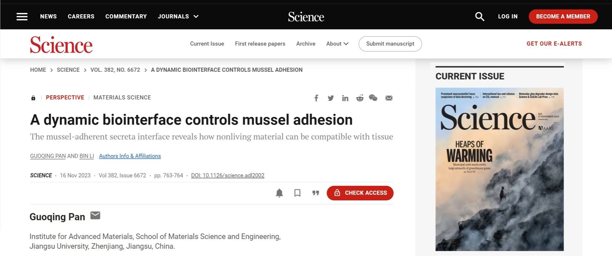 11月17日,国际著名学术期刊Science发表了我校材料科学与工程学院潘国庆教授、苏州大学李斌教授应邀合作撰写的题为A dynamic biointerface controls mussel adhesion(Doi: 10.1126/science.adl2002) 的前瞻性文章。开云足球体育_开云足球(中国)材料科学与工程学院、新材料研究院为该论文的第一单位,潘国庆为论文的第一作者及通讯作者。