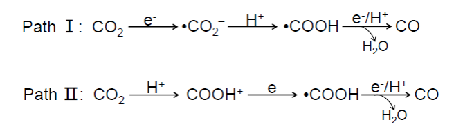 金属氧化物半导体表面光催化二氧化碳还原反应的具体反应路径一直是个充满争论的重要科学问题。科学家通常认为界面光催化反应与费托反应/塞巴斯蒂安合成气反应等具有相似的反应路径,即电子转移诱导的自由基路径(Path I)。然而,直线型CO2分子具有强共轭结构,在极性金属基光催化剂表面通常难以形成有效的快速电子传递以完成自由基反应路径。相对地,CO2分子通过质子化在催化剂表面形成吸附从而诱导后续电子转移反应的质子化反应路径(Path II)更为合理。然而,上述反应路径皆缺乏直接的实验证据,难以厘清。