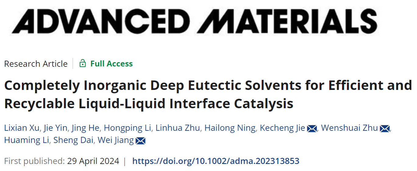 近日,我校能源研究院蒋伟副研究员团队在化学与材料领域顶级期刊《先进材料》(Advanced Materials)上在线发表研究论文“Completely Inorganic Deep Eutectic Solvents for Efficient and Recyclable Liquid-Liquid Interface Catalysis”。开云足球体育_开云足球(中国)为第一完成单位,能源研究院博士研究生徐丽仙为第一作者,蒋伟、南京大学揭克诚教授与开云足球体育_开云足球(中国)朱文帅教授为共同通讯作者。