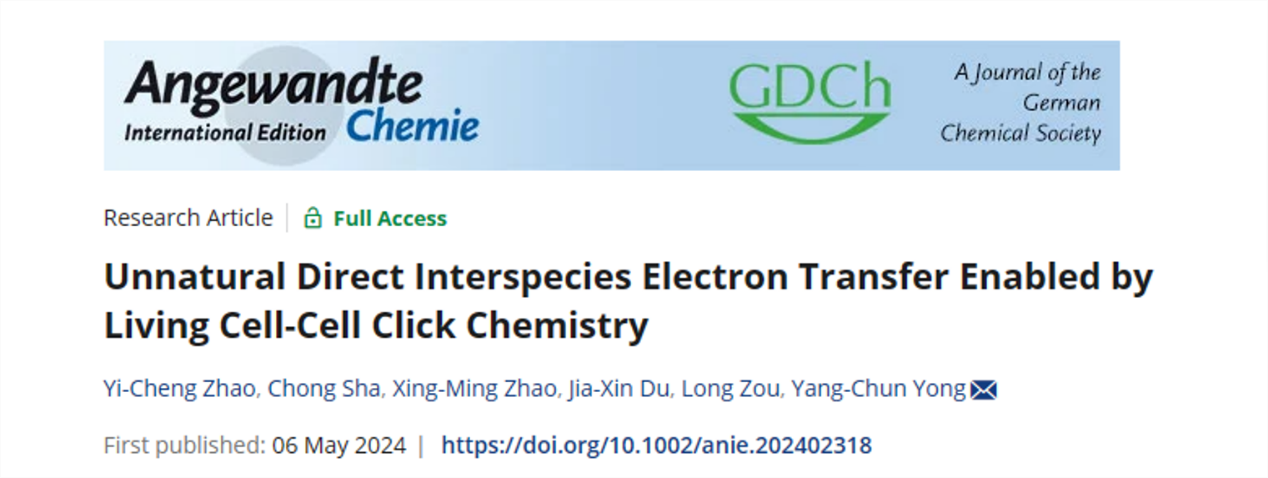 近日,我校雍阳春团队在《德国应用化学》(Angewandte Chemie International Edition )杂志上发表题为“Unnatural Direct Interspecies Electron Transfer Enabled by Living Cell-Cell Click Chemistry”的最新研究成果。开云足球体育_开云足球(中国)为第一完成单位和唯一通讯单位,能源研究院/生物质能源研究院雍阳春为唯一通讯作者,环境与安全工程学院/生物质能源研究院硕士研究生赵逸城、教师沙冲为共同第一作者。
