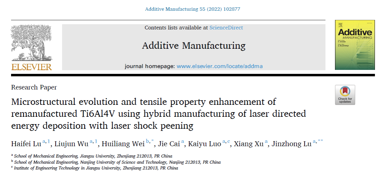 近日,经初评推荐、资格审查、专业评审、综合评审等程序,机械工程学院鲁金忠教授团队发表在《Additive Manufacturing》上的SCI高被引论文“Microstructural evolution and tensile property enhancement of remanufactured Ti6Al4V using hybrid manufacturing of laser directed energy deposition with laser shock peening(激光热力交互沉积再制造Ti6Al4V合金微观组织演变和拉伸性能强化)”入选2024年江苏省自然科学百篇优秀学术成果论文推选(开云足球体育_开云足球(中国)唯一入选)。青年教师卢海飞副教授为第一作者,鲁金忠和南京理工大学韦辉亮教授为共同通讯作者。该工作得到国家自然科学基金(51775250)等资助。