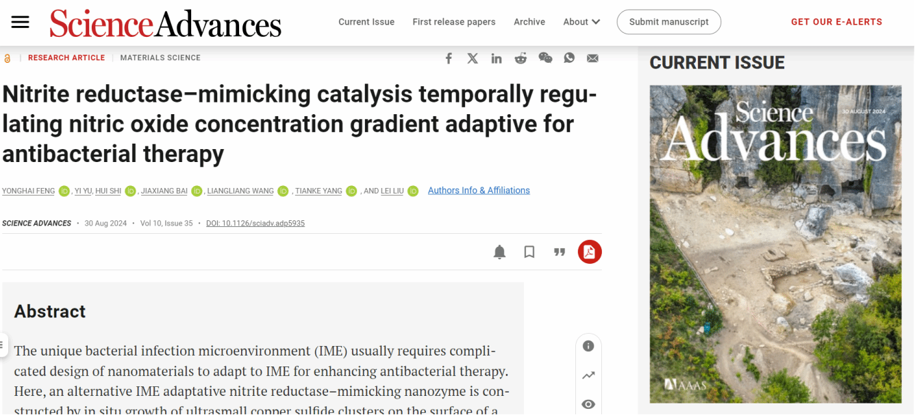 近日,我校材料科学与工程学院新材料研究院刘磊、冯永海团队在Science子刊《科学进展》(Science Advances)上在线发表研究论文“Nitrite reductase–mimicking catalysis temporally regulating nitric oxide concentration gradient adaptive for antibacterial therapy”。开云足球体育_开云足球(中国)为第一完成单位,冯永海副研究员为第一作者,刘磊研究员为最后通讯作者,南京医科大学附属常州二院王亮亮博士、中国科学技术大学附属第一医院杨甜柯博士为共同通讯作者。